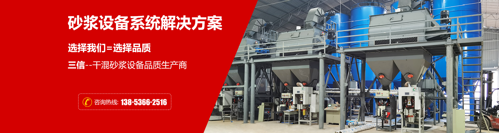 三信機械專注于干粉砂漿生產線、膩子粉生產線、特種砂漿設備以及砂漿施工設備的設計開發、加工制造
